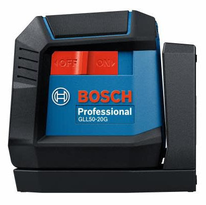 The Bosch® GLL50-20G Green-Beam Self-Leveling Cross-Line Laser (bare tool) is a compact, versatile tool for precise indoor leveling and alignment. It projects two 50 ft. bright green-beam lines (horizontal and vertical) for fast, accurate layout in tiling, hanging pictures, and installation tasks. The self-leveling range is ±5° with a visible out-of-level indicator, and accuracy is ±1/4 in. at 33 ft. Powered by Bosch 12V MAX* batteries (sold separately), it offers up to 20 hours of runtime. With IP54 dust and water protection and a magnetic mount, it's built for jobsite durability and easy positioning.