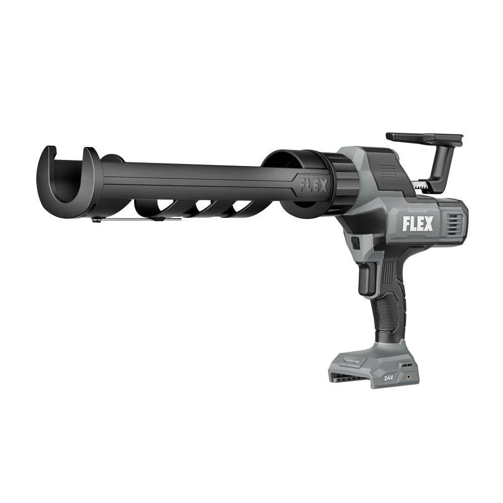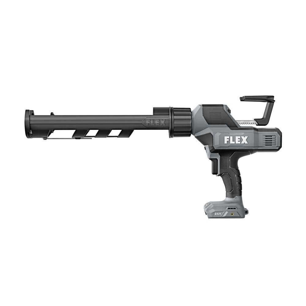 The FLEX® 24V Brushless 29 oz. Caulk and Adhesive Gun (Bare Tool) is a cordless tool designed for efficient dispensing of caulk and adhesives without hoses or compressors, delivering smooth, consistent flow with variable speed control. It dispenses up to 10 tubes on a single charge with a 5.0Ah lithium-ion battery (sold separately), offering extended runtime for demanding tasks. The ergonomic handle with rubber grip reduces fatigue, while the quick-change nozzle system allows easy swaps. The heavy-duty belt clip mounts on either side, and a pivoting hook provides easy storage. Accepting 10 oz. or 29 oz. cartridges, it leverages the FLEX Advantage: 20% more power with 24V lithium, 25% longer runtime via THERMA-TECH™, and up to 50% faster charging.