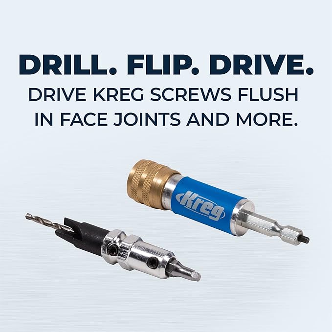 The Kreg Quick-Flip makes it possible to use Kreg Screws for a variety of strong, simple joints – all with one single tool. Drill a pilot hole and counterbore with one side, then drive a Kreg Screw with the #2 square-drive bit on the other side. With this dual-action tool, you can quickly make joints using Kreg Screws in many different applications. Kreg Screws are perfect for pocket-hole joints, but their strength and high-quality engineering make them ideal for other uses, too. Use the Quick-Flip with Kreg Screws to quickly face-join corners, attach false fronts to drawers, and much more. The Quick-Flip features a double-ended insert in a quick-release housing. On one end, a drill bit is sized to drill a perfect pilot hole for a Kreg Screw, plus a cutter that drills a flat-bottomed counterbore that the screw head fits into. Then flip the insert around to expose the other end: a #2 square-drive bit specially designed for use with Kreg Screws.
