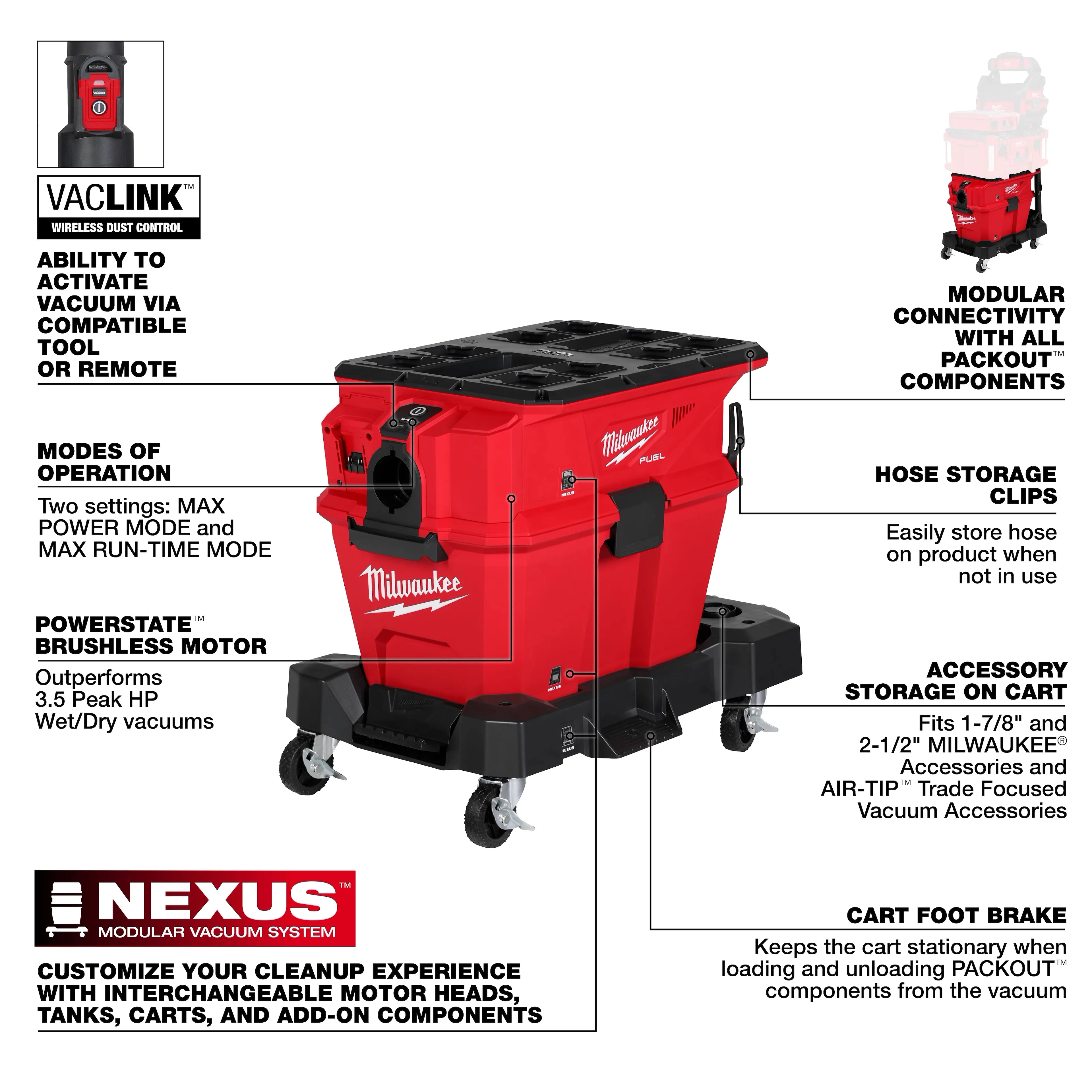 The M18 FUEL™ NEXUS™ 6 Gallon Wet/Dry Vacuum w/ PACKOUT™ Compatibility & VACLINK™ delivers corded performance with over 40 minutes of continuous cleaning, allowing users to clean anywhere without cord limitations. It features a POWERSTATE™ Brushless Motor and REDLINK PLUS™ Intelligence that provide 95 CFM and outperform 3.5 Peak HP wet/dry vacuums for cleaning common jobsite debris. On an M18 REDLITHIUM™ FORGE™ HD12.0 battery pack, it cleans up to 1,800 sq ft. per charge or up to 44 minutes in max run-time mode. This cordless design eliminates hazards like slips, trips, and falls, and reduces the need to search for power. It is quieter than leading corded competitors and suitable for any environment. As part of the NEXUS™ Modular Vacuum System, it supports customization with interchangeable motorheads, tanks, carts, and add-ons. The top is compatible with the Milwaukee® PACKOUT™ Modular Storage System, and it includes VACLINK™ Wireless Dust Control for remote activation via compatible tools or the included remote, enhancing efficiency and minimizing wasted run-time.