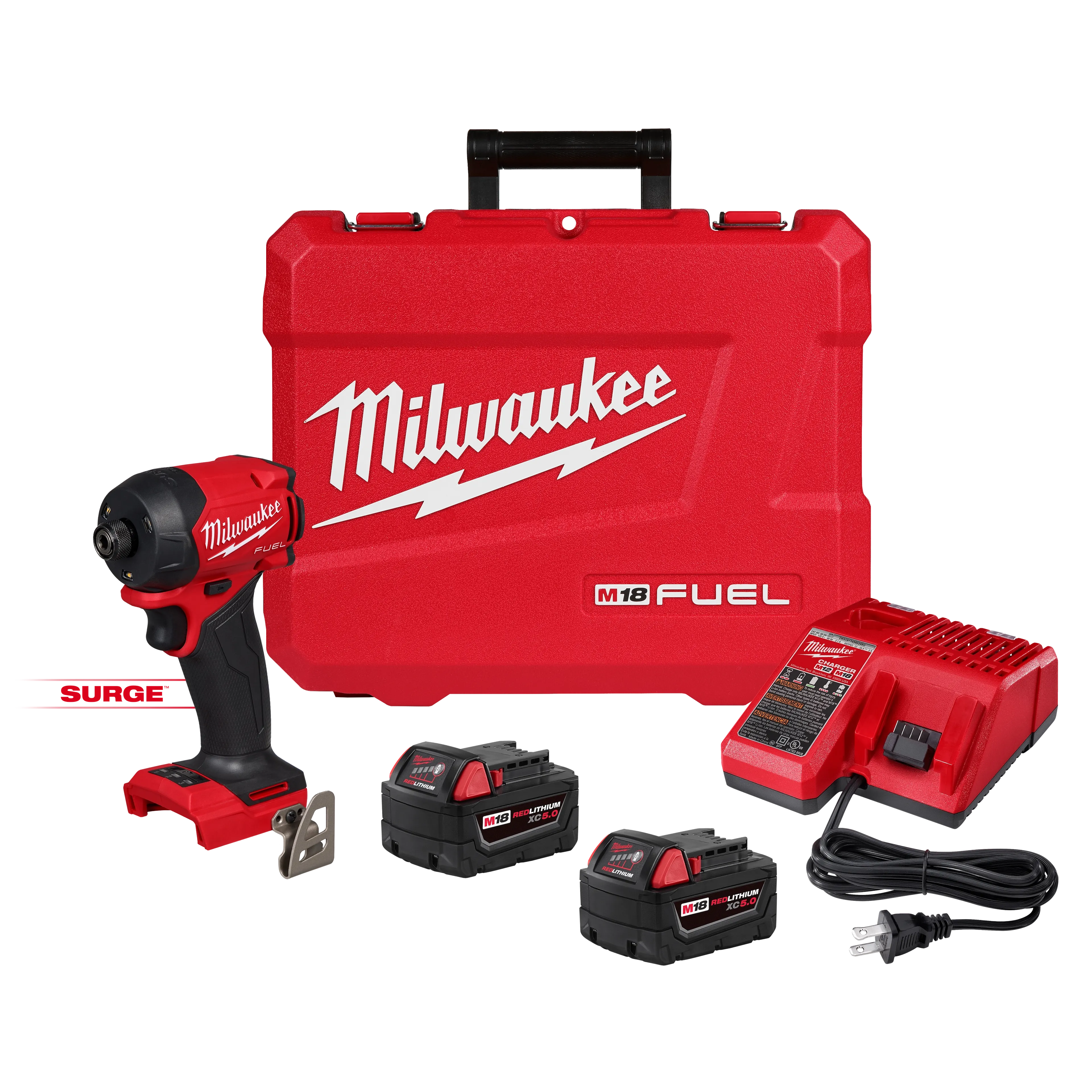 The Milwaukee® M18 FUEL™ SURGE™ 1/4" Hex Hydraulic Driver Kit (2761-22) is a cordless power tool redesigned for increased productivity, with industry-leading reductions in sound and vibration. It features a FLUID-DRIVE™ Hydraulic Powertrain for 50% quieter operation and 3X less vibration compared to standard impact drivers, up to 3X faster driving speeds than the previous generation, and 1000in-lbs of torque via a POWERSTATE™ Brushless Motor. REDLINK PLUS™ Intelligence provides thermal protection, and the compact design (4.33” long) improves access in tight spaces, with Tri-LED lighting for visibility.