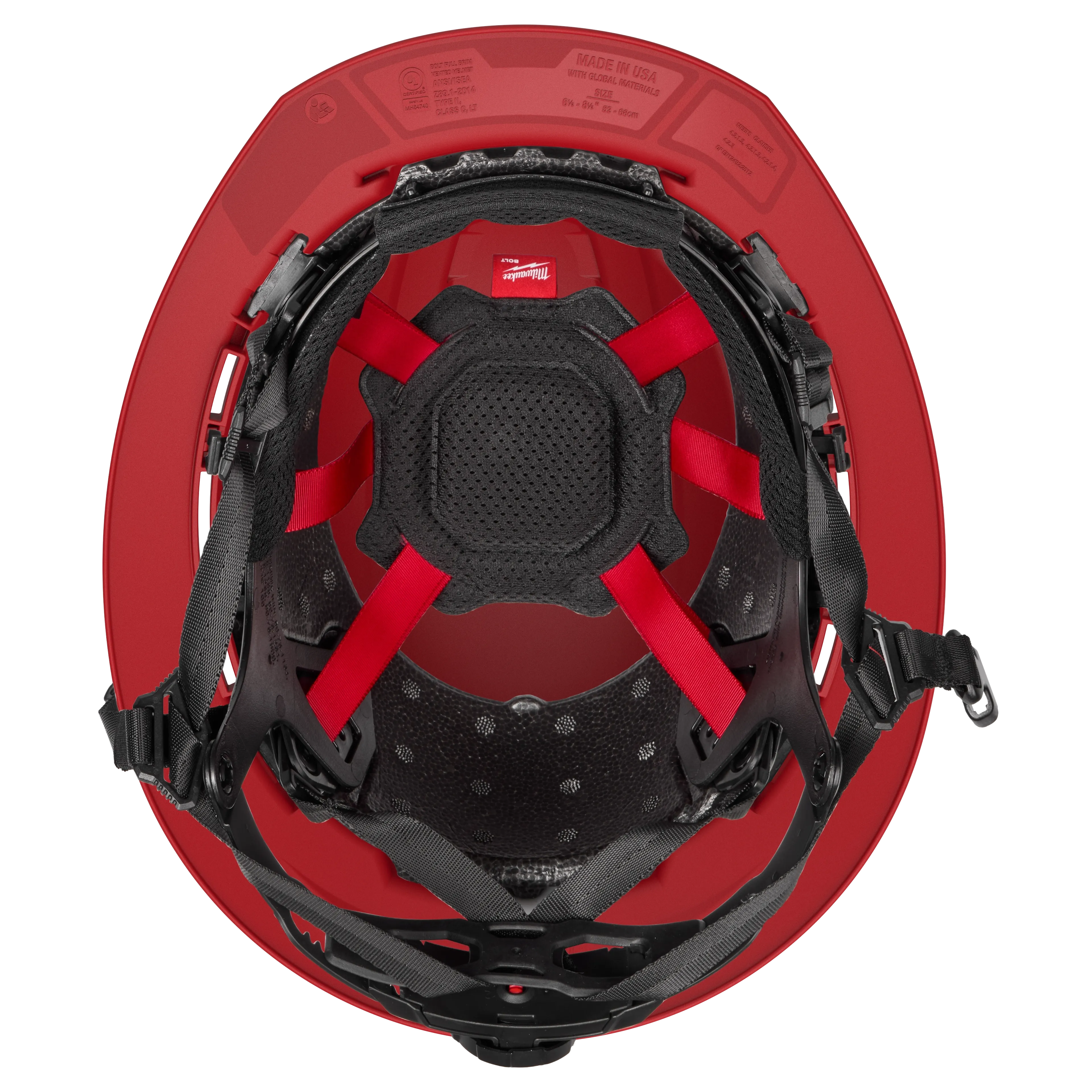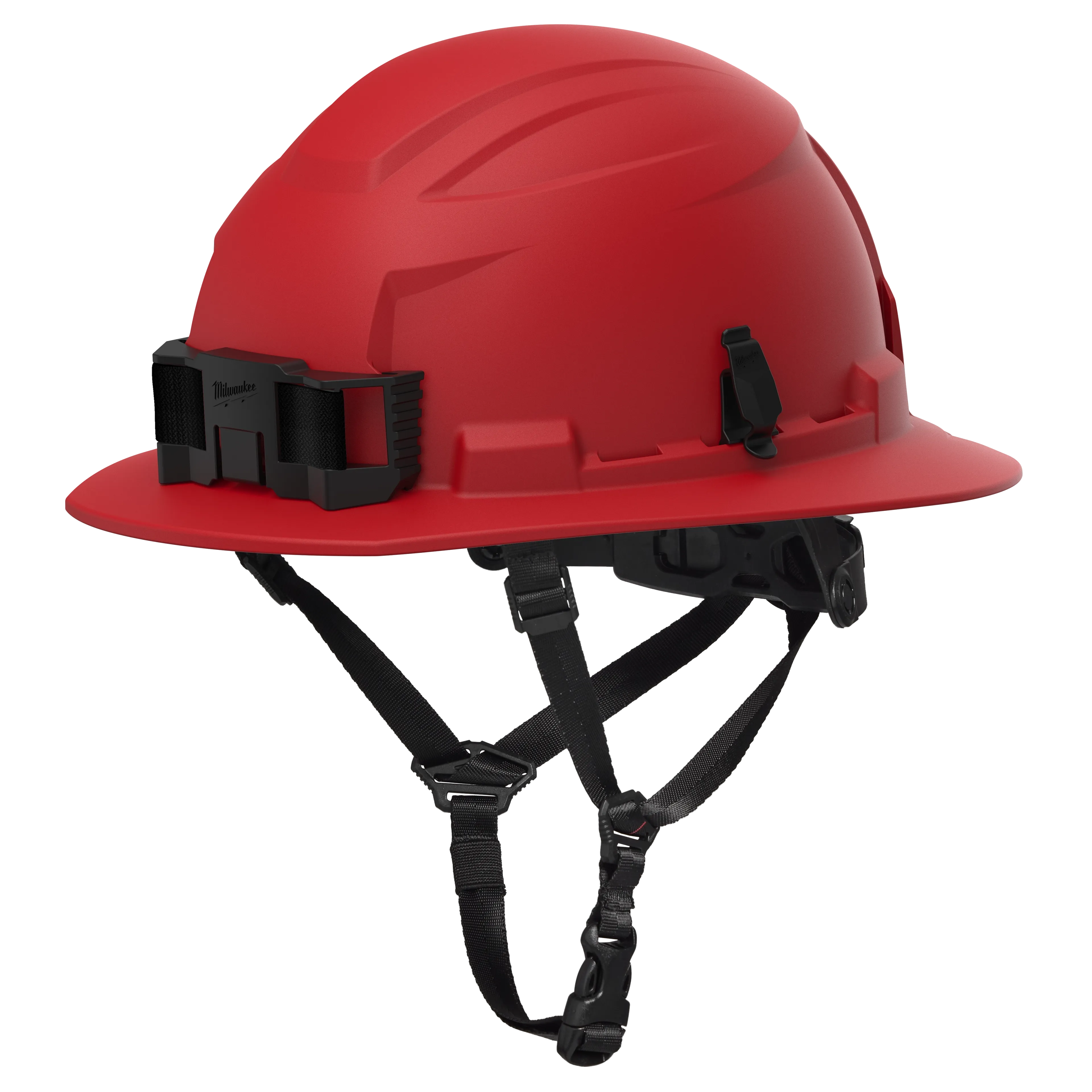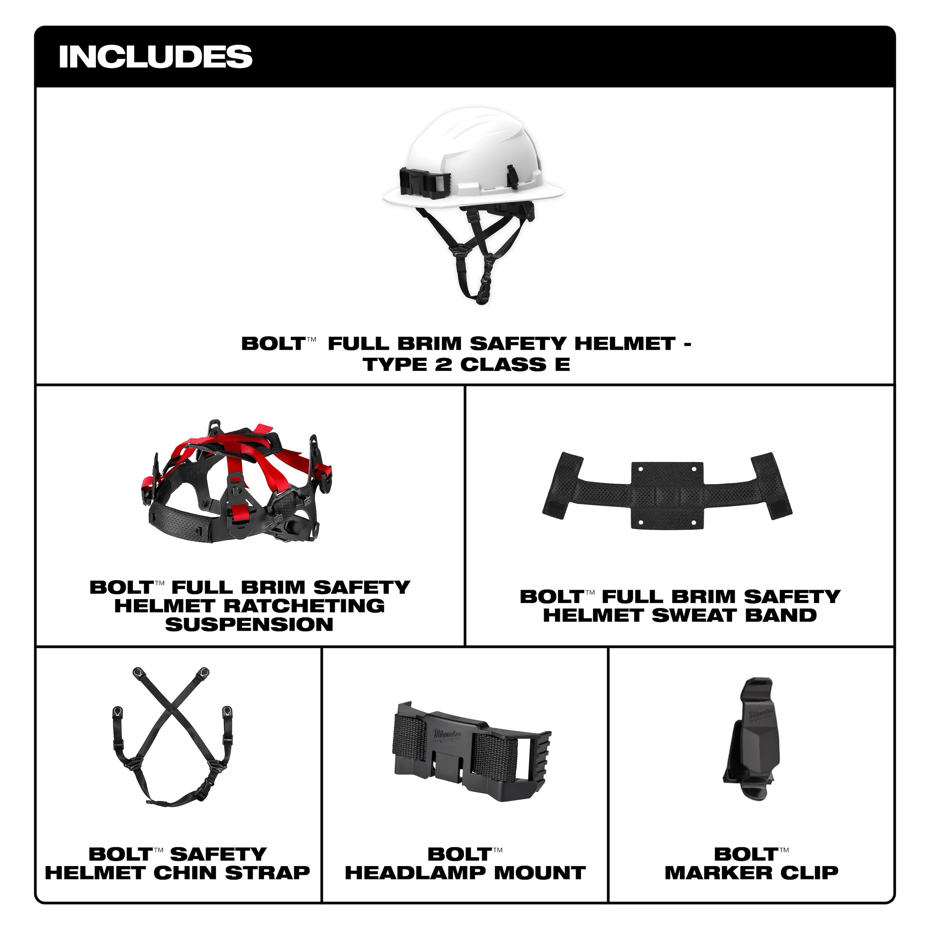 The Milwaukee® BOLT™ Red Full Brim Safety Helmet (48-73-1659) is a Type 2, Class E non-vented helmet designed for superior protection and comfort on the jobsite. It offers up to 15 degrees cooler temperature than competitive full brim helmets and is the lightest weight full brim helmet available. Providing protection from top and side impacts, it features BOLT™ Accessory Compatibility with four accessory slots and two universal slots for integrating PPE. Includes a BOLT™ Headlamp Mount and Marker Clip for convenience. The comfortable padded suspension with adjustable swinging ratchet and five-point chin strap ensures a secure fit, with an antimicrobial, machine-washable sweatband and liner to prevent odor and bacteria buildup. ANSI/ISEA Z89.1 Type 2 Class E certified, it meets EN12492:2015 standards, made in USA with global materials, and backed by a limited lifetime warranty.