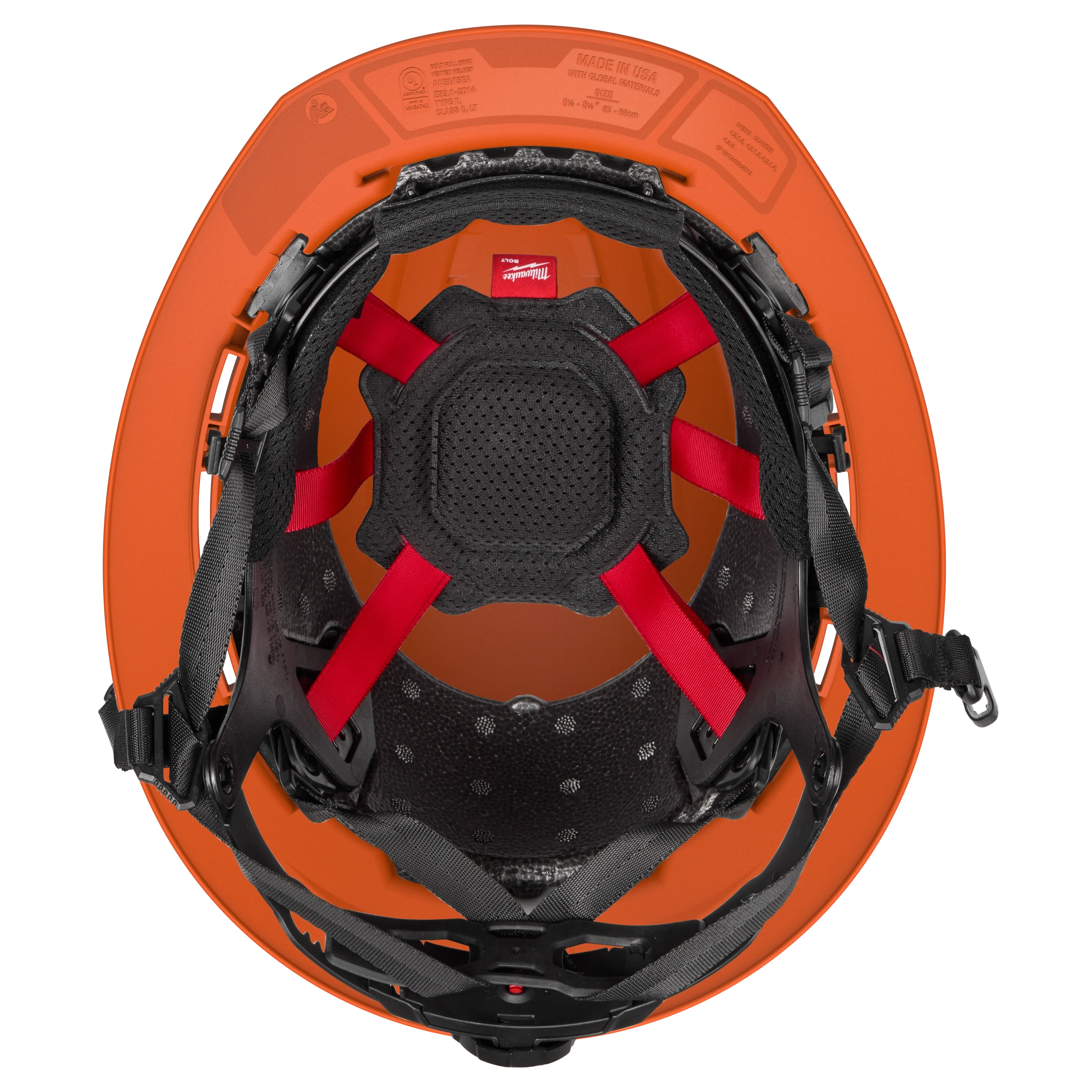 The Milwaukee® BOLT™ Orange Full Brim Non-Vented Safety Helmet – Type 2, Class E (48-73-1689) is a bright orange hard hat with a full brim and adjustable black straps, designed for industrial use, conforming to Type 2 and Class E safety standards. It delivers better protection and more comfort, up to 15 degrees cooler than other Full Brim Safety Helmets, and is the lightest weight full brim helmet available. It protects from top and side impacts, with BOLT™ Accessory Compatibility via four accessory slots and two universal slots for integrating PPE. Includes a BOLT™ Headlamp Mount for most headlamps and a BOLT™ Marker Clip for pens and markers. Features comfortable padded suspension, adjustable swinging ratchet, five-point chin strap, antimicrobial sweatband and liner (machine-washable), ANSI type 2 certification, and customizable logos.