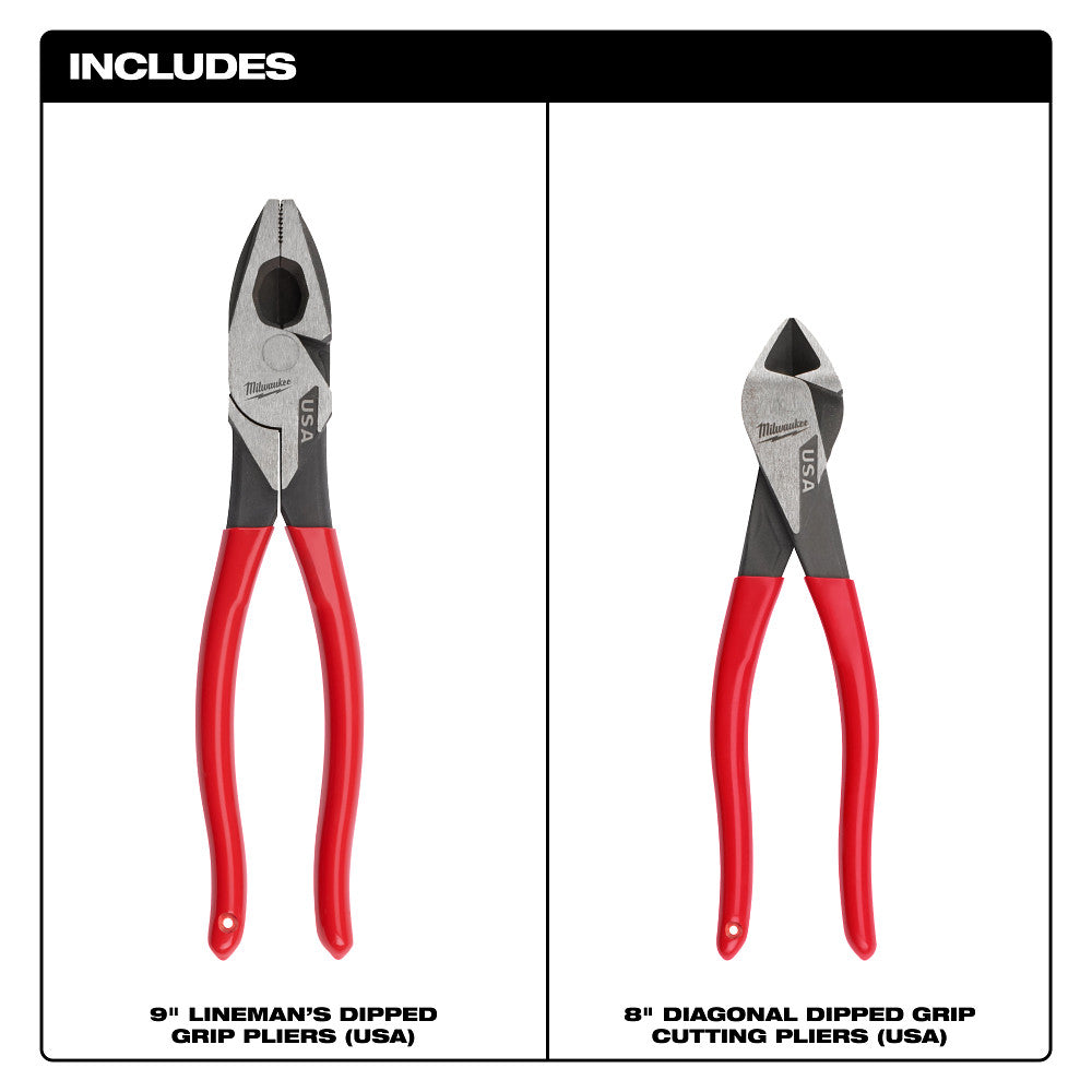 The MILWAUKEE 2PC Dipped Grip Cutting Pliers Set (USA) delivers the easiest cuts and a lasting edge for the professional user. Our 9" Lineman Dipped Grip Pliers are designed with an optimized pivot point to provide the best leverage for tough cuts through materials like ACSR, hard wire, and soft wire. Our 9" Lineman and 8" Diagonal Cutting Pliers feature laser-hardened edges and teeth for extended cut life and maximum grip. Our pliers are engineered to deliver the smoothest open and close experience from the start with no break-in period required. Our Lineman's Pliers include a reaming head for ½-inch to 1-inch conduit and a fish tape puller for additional versatility. Our pliers are tether-ready and offered in both dipped grip with a split-ring hole and comfort grip with a lanyard hole. Our 2pc Dipped Grip Pliers Set is made in the USA with best-in-class manufacturing technology and USA-sourced materials, including durable, press-forged steel backed by a complete Lifetime Guarantee..