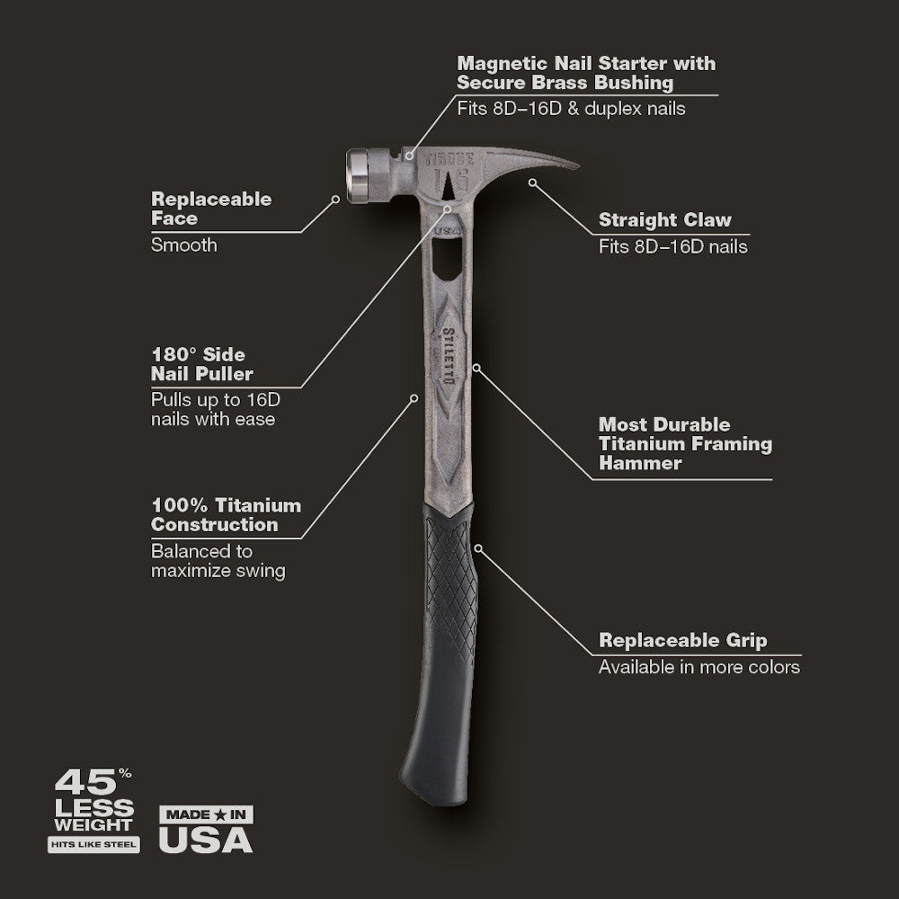 The STILETTO 15oz TIBONE Hammer with Smooth Steel Face and Curved Handle is Stiletto Tool's most powerful and most durable hammer. This All-Titanium hammer is 45% less weight and hits like steel. The durable TIBONE design is best for framing and pulling nails. The 180° side nail puller and Magnetic Nail Starter fit up to 16D and Duplex Nails. The TIBONE Titanium Framing Hammer features a replaceable steel face and multiple grip colors, extending the life of the hammer and providing a personal touch..