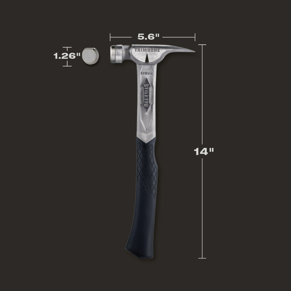 The STILETTO 10oz TRIMBONE Hammer with Smooth Steel Face and Curved Handle is designed for finish with specialized features. This titanium hammer is 45% less weight and hits like steel. The compact D-Face and Trim Claw are ideal for tight spaces. The TRIMBONE also features a steel face and a replaceable grip, available in 5 colors. extending the life of the hammer and providing a personal touch. The 180° side nail puller is ideal for 2D-10D nails but has the power to pull up to 16D..