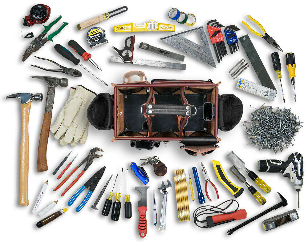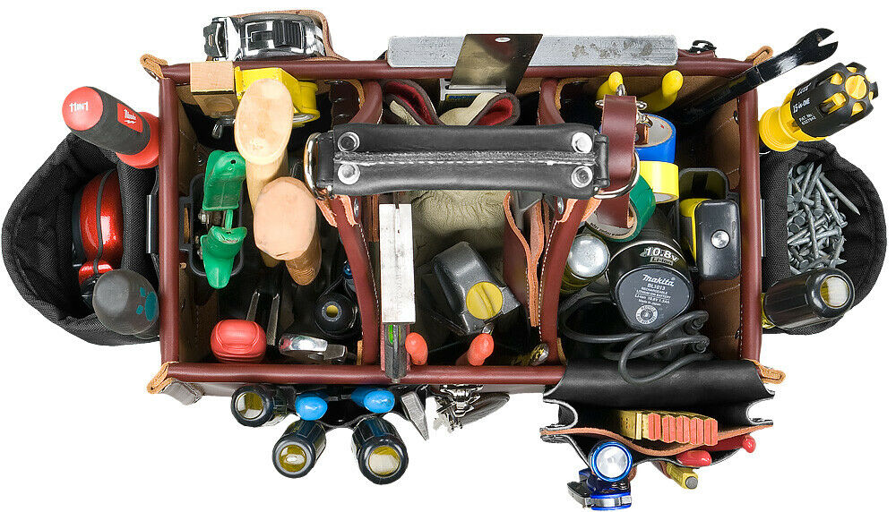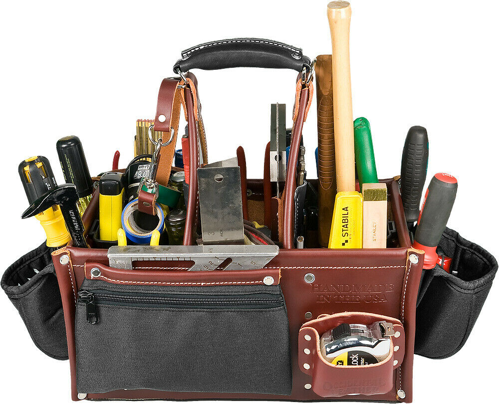 An industrial work of art. Handcrafted leather handle ƒ??moldsƒ?� to your grip. This eight by fourteen inch tool carrier features 3 compartments with 45 pockets and tool holders. Innovative upright storage for quick access.