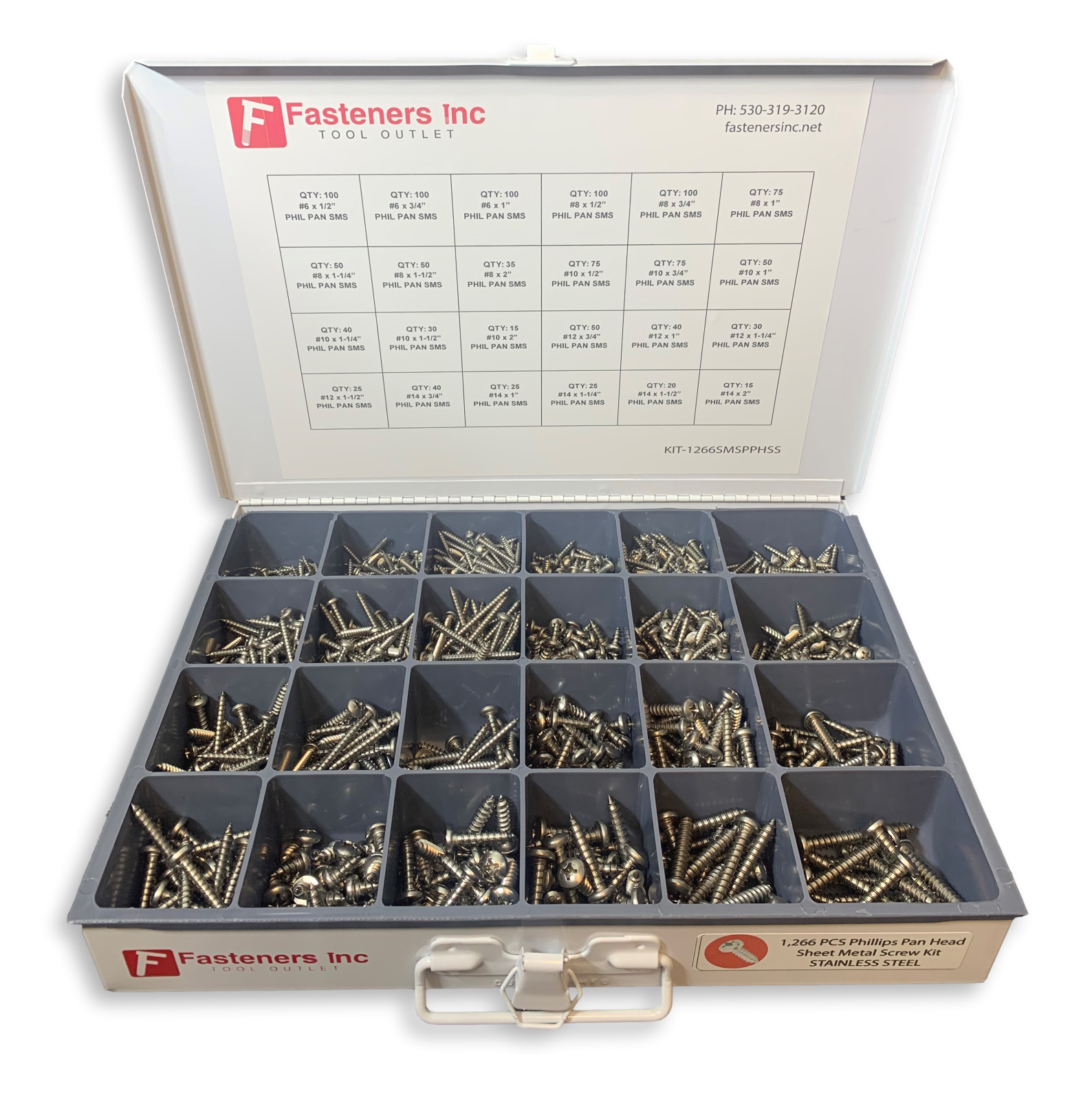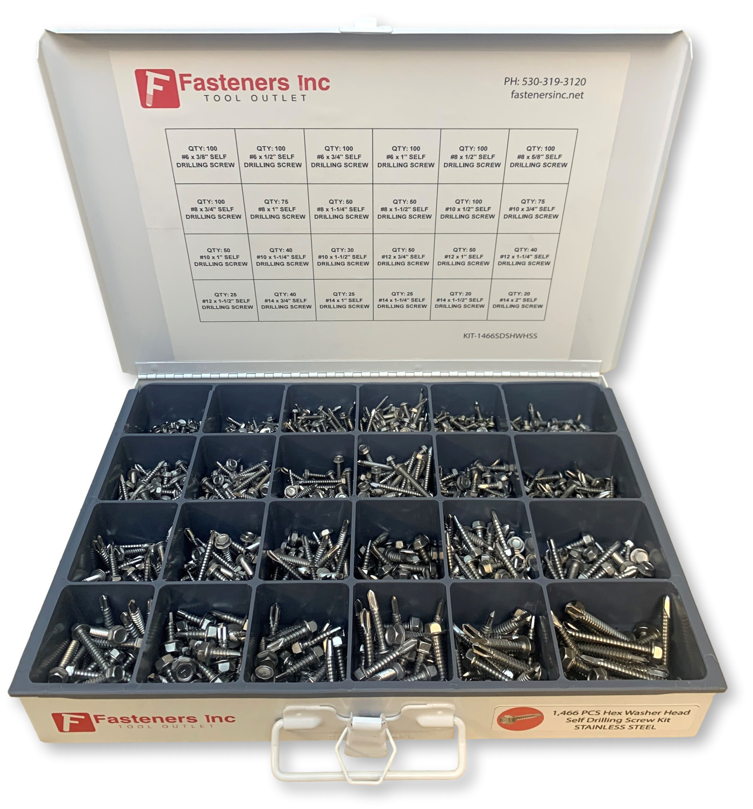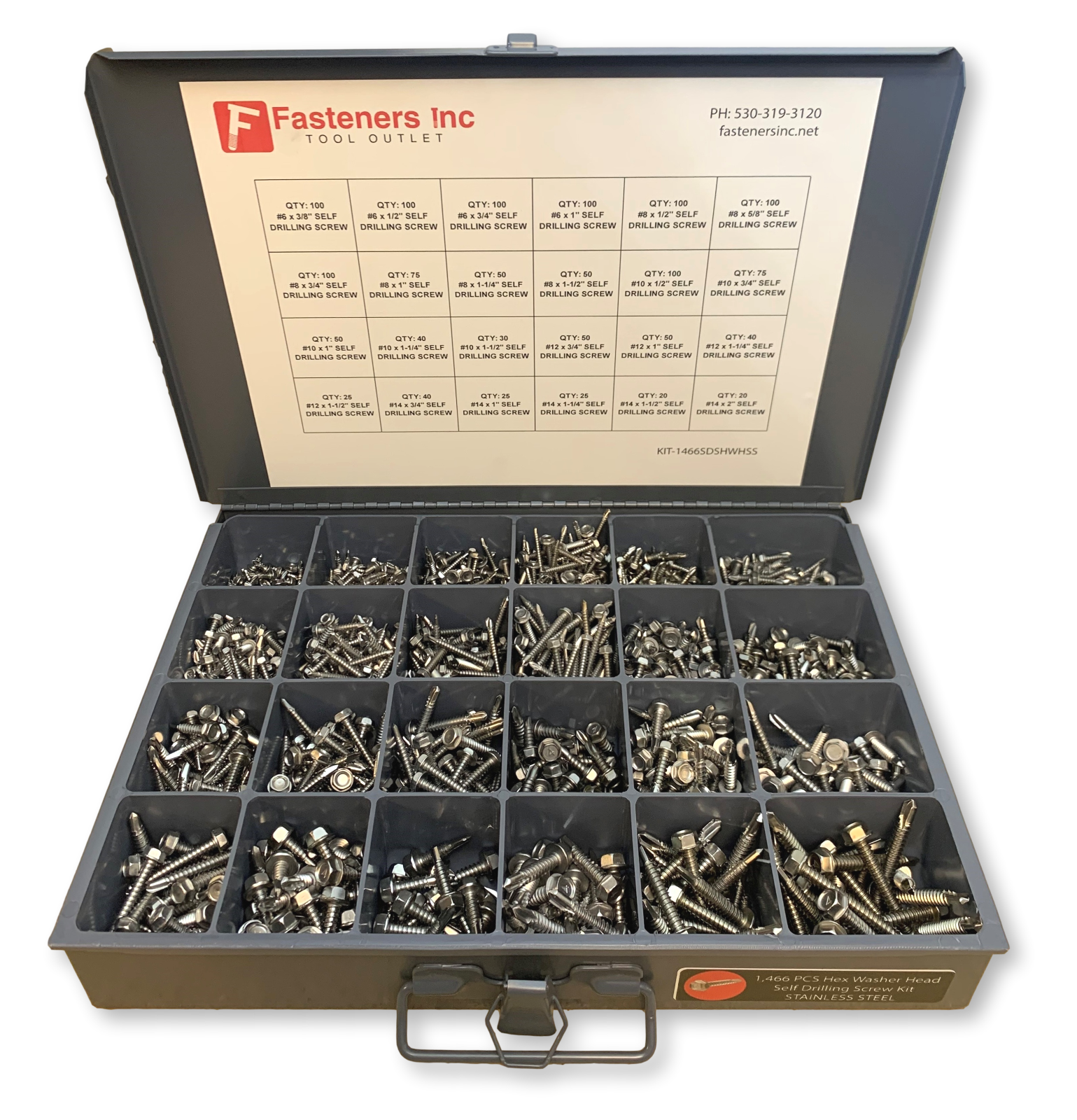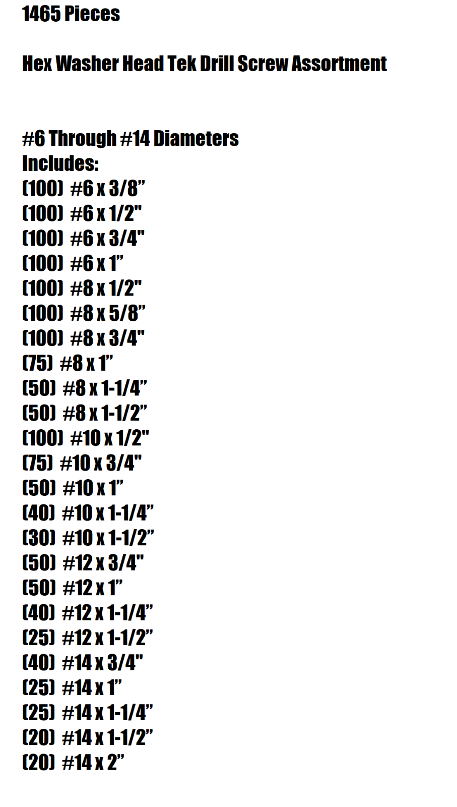 1466 Pieces STAINLESS STEEL Hex Washer Head Tek Drill Screw Assortment Storage Box Box Dimensions: 13-3/8"x9-1/4"x2" #6 Through #14 Diameters |