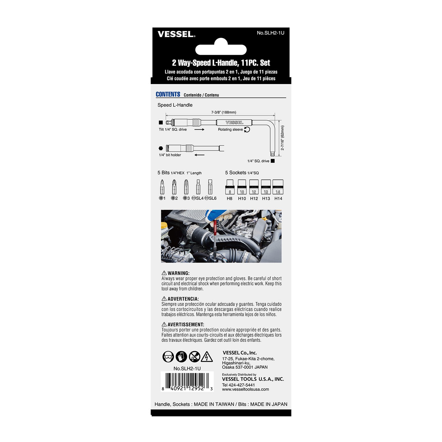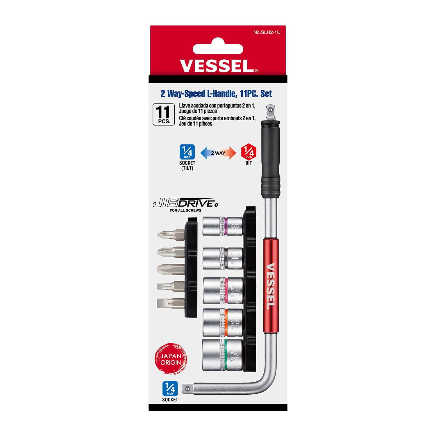 The Vessel® 2 Way-Speed L-Handle, 11PC. Set No.SLH21U is a versatile screwdriver set designed for efficient and powerful fastening. The long handle enables strong tightening, while the smooth rotating sleeve allows for quick turning. With a push or pull collar, it easily attaches bits or sockets, and features a 15-degree tilt or solid position for flexibility in tight spaces. Ideal for assembly, repair, and general hand tool tasks, this set provides professional-grade performance.
